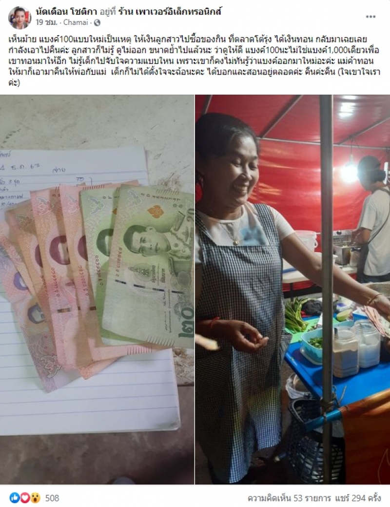 ยกได้ว่าเป็นอีกหนึ่งเรื่องราวที่ได้รับคำชื่นชมเป็นอย่างมาก เมื่อผู้ใช้เฟซบุ๊กรายหนึ่งได้โพสต์เรื่องราว หลังจากที่ลูกสาวของตนนำแบงค์ร้อยที่ระลึกไปซื้อของ แต่กลับได้เงินทอนมาจำนวนมาก ซึ่งคาดว่าแม่ค้าน่าจะเข้าใจผิดคิดว่าเป็นแบงค์หนึ่งพัน ตนจึงได้พาลูกสาวนำเงินไปคืนให้กับแม่ค้า