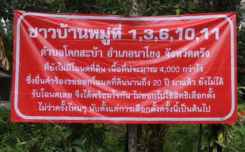 ล่าสุดมีรายงานว่าชาวบ้าน 5 หมู่บ้าน ของ ต.โคกสะบ้า อ.นาโยง จ.ตรัง รวมกว่า 1,300 ครัวเรือน เสียใจที่ทางอำเภอ และจังหวัด รวมทั้งการเลือกตั้งผู้นำทุกระดับไม่เคยช่วยเหลือเรื่องที่ดิน รวมกว่า 4 พันไร่ ขึ้นป้ายประกาศไม่ไปใช้สิทธิเลือกตั้งในวันพรุ่งนี้ เพราะผู้นำในพื้นที่ไม่เคยเหลียวแล มาเฉพาะตอนขอคะแนนเสียงว่า หากได้รับการเลือกตั้ง จะช่วยแก้ปัญหาให้ แต่พอได้แล้วก็หายไปหมด
