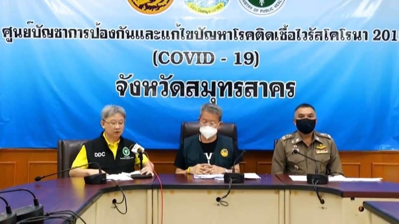 เมื่อเวลา 21.00 น. น.พ.โอภาส การย์กวินพงศ์ พล.ต.ต.วัฒนา ยี่จีน รอง ผบช.ภ.7 นายวีระศักดิ์ วิจิตรแสงศรี ผู้ว่าฯ สมุทรสาคร ร่วมกันแถลงผ่านโทรทัศน์รวมการฉพาะกิจแห่งประเทศไทย เกี่ยวกับวถานการณ์ในจ.สมุทรสาคร