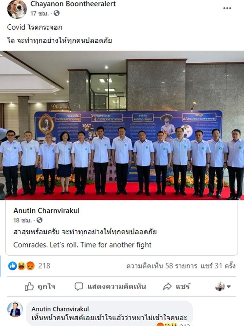 จากกรณีที่ นายอนุทิน ชาญวีรกูล รมว.สาธารณสุข ได้โพสต์เฟซบุ๊กเป็นภาพที่ถ่ายร่วมกับทีมผู้บริหารกระทรวงสาธารณสุข พร้อมข้อความว่า "สาสุขพร้อมครับ จะทำทุกอย่างให้ทุกคนปลอดภัย Comrades. Let s roll. Time for another fight" โดยมีผู้แชร์โพสต์ดังกล่าวออกไปเป็นจำนวนมาก หนึ่งในนั้น คือ นพ.ชญานนท์ บุญธีระเลิศ ที่แชร์โพสต์ของนายอนุทิน