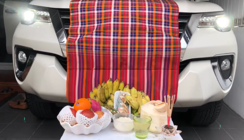 เวลาเช้าจัดโต๊ะที่หน้ารถ สตาร์ทเครื่องยนต์ บีบแตร 3 ทีเพื่อเอาฤกษ์เอาชัยและจุดธูป 9 ดอกบอกถวายเฉพาะแม่ย่านางรถอย่างเดียวเท่านั้น