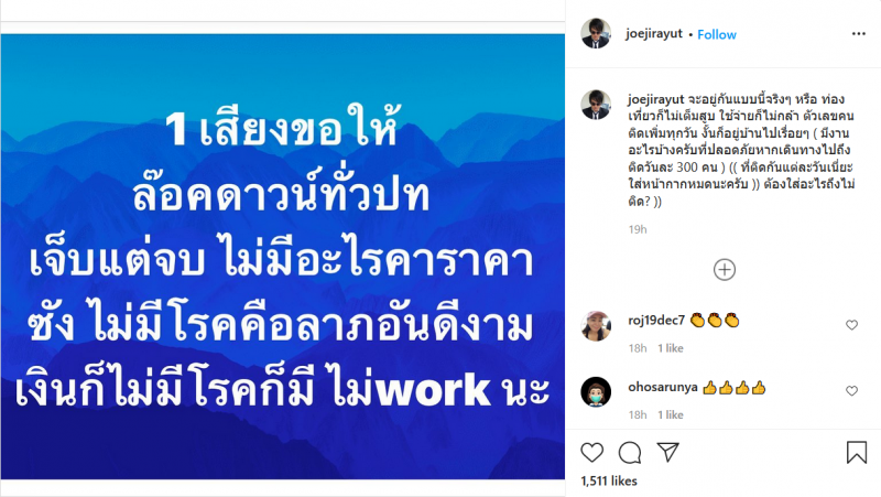 ทำให้ล่าสุด นายจิรายุส วรรธนะสิน หรือ โจ นูโว นักร้องชื่อดัง ได้โพสต์ข้อความลงบนอินสตาแกรมส่วนตัว joejirayut ระบุว่า 1 เสียงขอให้ล็อกดาวน์ทั่วปท. เจ็บแต่จบ ไม่มีอะไรคาราคาซัง ไม่มีโร ค คือลาภอันดีงาม เงินก็ไม่มี โร ค ก็มีไม่ work นะ