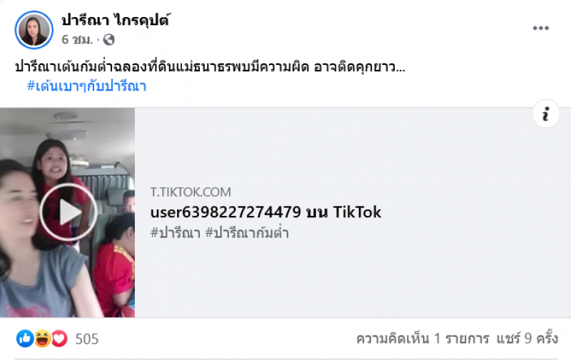 วันเดียวกัน น.ส.ปารีณา ไกรคุปต์ ส.ส.ราชบุรี เขต 3 พรรคพลังประชารัฐ โพสต์คลิปวิดีโอจากติ๊กต็อก พร้อมเต้นประกอบเพลง ก้มต่ำ พร้อมขอบคุณอธิบดีคนใหม่ไม่เลือกปฏิบัติเหมือนที่ผ่านมา