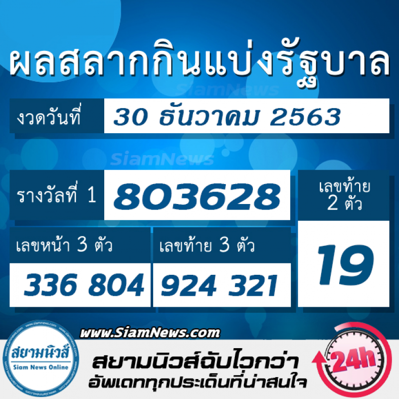 ผ่านไปแล้วสำหรับการประกาศผลสลากกินแบ่งรัฐบาล ประจำวันที่ 30 ธันวาคม 2563 รางวัลที่ 1 ออกหมายเลข 803628 ส่วนรางวัล เลขหน้า 3 ตัว ออกหมายเลข 804 และ 336 รางวัลเลขท้าย 3 ตัว ออกหมายเลข 924 และ 321 ขณะที่รางวัลเลขท้าย 2 ตัว ออกหมายเลข 19 เชื่อว่าหลายท่านคงจะกำลังเฮเตรียมเลี้ยงฉลอง