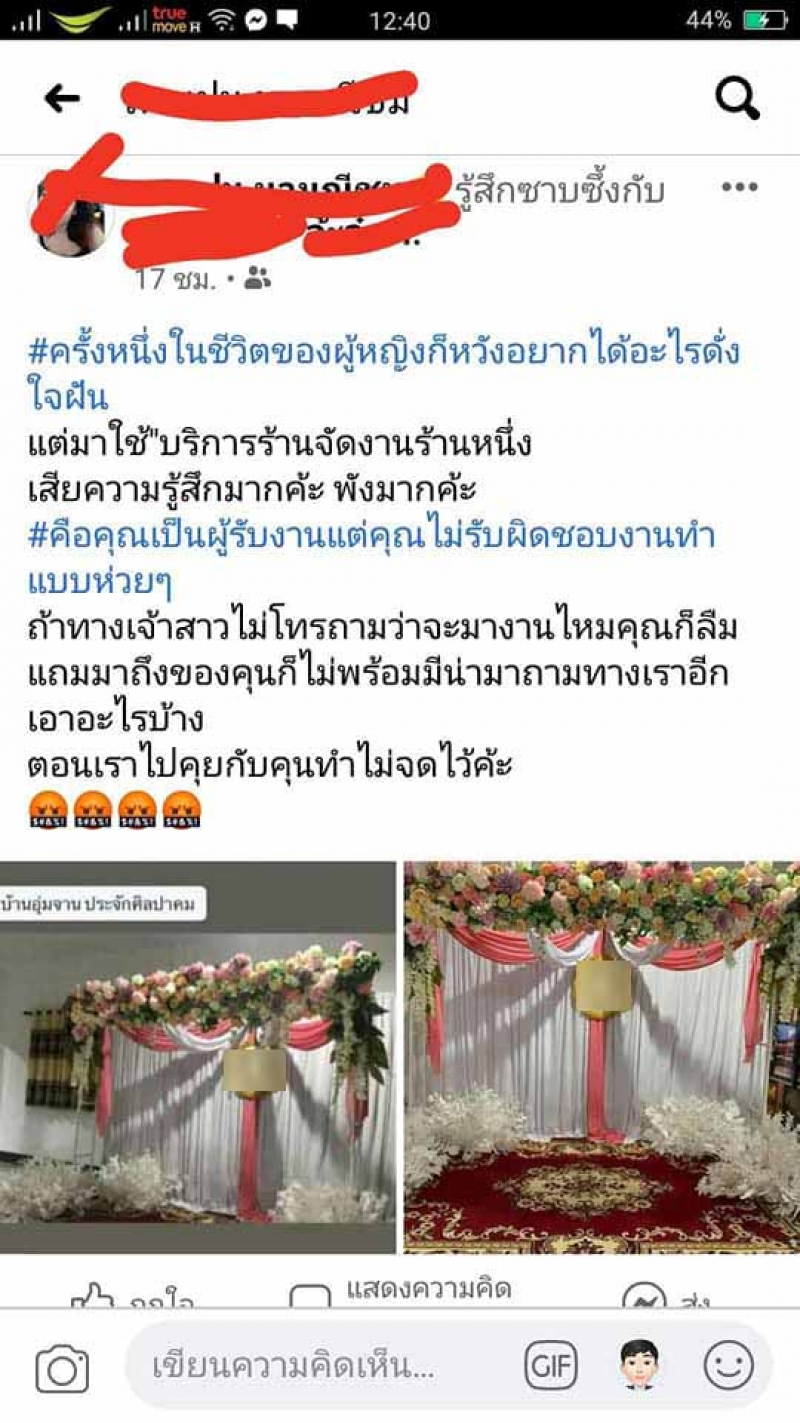 เเต่ขณะเดียวกันก็พบว่ามีเพื่อนเจ้าสาวที่มาร่วมงานเเต่ง ได้โพสต์วิพากษ์วิจารณ์ว่าซุ้มที่ได้ไม่ตรงปก ซึ่งตนรู้สึกเสียใจมาก เพราะงานตรงกันทุกอย่าง ขาดเเค่หงส์ โดยตนก็ได้อภิบายใต้คอมเมนต์ไปเเล้ว ส่วนที่คู่กรณีกล่าวหาว่าตนลืมงานจนเจ้าภาพต้องทวง ซึ่งตนยอมรับว่าลืมจริง เเต่เจ้าภาพก็เพิ่งส่งเเบบซุ้มมาให้วันที่ 1 ม.ค.64 ตนก็เดินทางไปจัดซุ้มได้เสร็จตามกำหนด โดยที่งานก็ไม่ได้ เสีย หาย