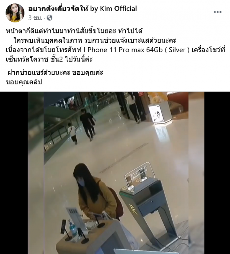 วันที่ 5 มกราคม เฟซบุ๊กเพจ อยากดังเดี๋ยวจัดให้ by Kim Official ได้มีการโพสต์คลิป หญิงสาวรายหนึ่งที่ไปขโมยโทรศัพท์มือถือภายในห้างแห่งหนึ่ง จึงอยากขอความช่วยเหลือหากใครพบเห็นหรือรู้จักให้ติดต่อแจ้งเบาะแส โดยระบุว่า ใครพบเห็นบุคคลในภาพ รบกวนช่วยแจ้งเบาะแสด้วยนะคะ เนื่องจากได้ขโมยโทรศัพท์ I Phone 11 Pro max 64Gb ( Silver ) เครื่องโชว์ที่เซ็นทรัลโคราช ชั้น2 ไปวันนี้ค่ะ