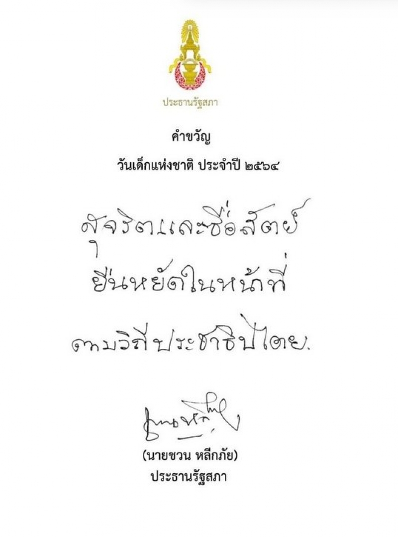 วันที่ 5 ม.ค. 264 นายชวน หลีกภัย ประธานสภาผู้แทนราษฎร ฐานะประธานรัฐสภาได้มอบคำขวัญวันเด็กแห่งชาติ ประจำปี 2564 ว่า สุจริตและซื่อสัตย์ ยืดหยัดในหน้าที่ ตามวิถีประชาธิปไตย