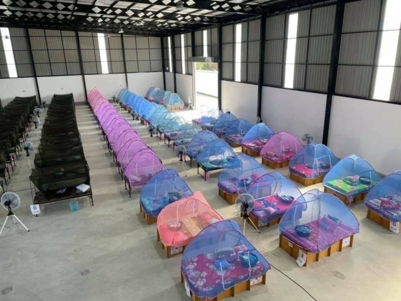 ทั้ง นี้ในโลกออนไลน์ ได้มีการเผยภาพ ใน รพ.สนาม ซึ่งมีการจัดที่นอน และ สถานที่รับประทานอาหาร เว้นระยะห่างตามมาตรการป้องกัน