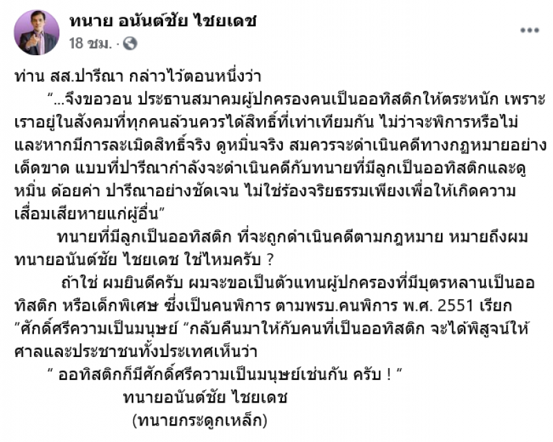 ต่อมา ทนายอนันต์ชัย โพสต์ข้อความผ่านทางเฟซบุ๊ก ระบุว่า จะขอเป็นตัวแทนผู้ปกครองที่มีบุตรหลานเป็นออทิสติก หรือเด็กพิเศษ ซึ่งเป็นคน พิ กา ร ตามพ.ร.บ.คนพิการ พ.ศ. 2551 เรียก ศักดิ์ศรีความเป็นมนุษย์ กลับคืนมาให้กับคนที่เป็น ออ ทิสติก จะได้พิสูจน์ให้ศาลและประชาชนทั้งประเทศเห็นว่า ออทิสติก ก็มีศักดิ์ศรีความเป็นมนุษย์เช่นกัน ครับ