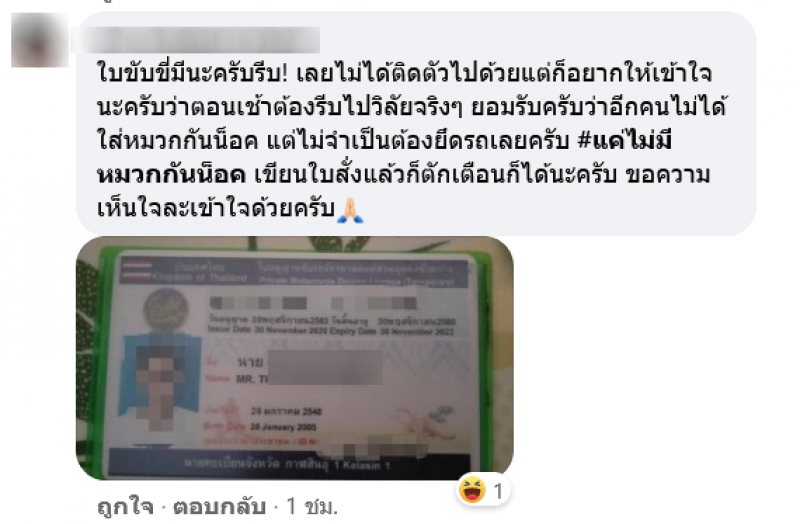 อย่างไรก็ตาม นักเรียนเจ้าของรถได้มีการมาตอบคอมเม้นต์ว่า มีใบขับขี่แต่รีบเลยไม่ได้พกติดตัวไป ส่วนเรื่องทะเบียนรถนั้นเป็นรถ จยย. ที่เพิ่งออกมาใหม่ ทำให้ไม่มีป้ายทะเบียน แต่มีใบรับรองขออนุญาติขับขี่ ที่ทางร้านให้มา