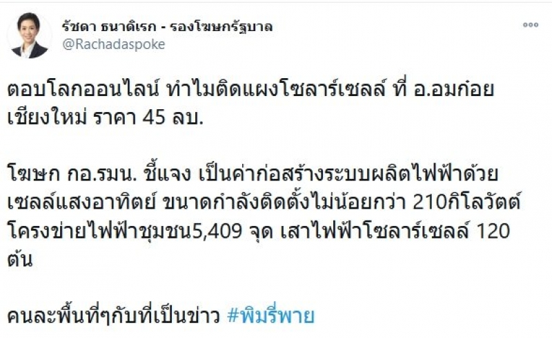 โดยล่าสุด ดร.รัชดา ธนาดิเรก รองโฆษกรัฐบาล ออกมาให้ข้อมูลสมทบ โดยชี้แจงผ่านทวิตเตอร์ส่วนตัวว่า ตอบโลกออนไลน์ ทำไมติดแผงโซลาร์เซลล์ ที่ อ.อมก๋อย เชียงใหม่ ราคา 45 ลบ. โฆษก กอ.รมน. ชี้แจง เป็นค่าก่อสร้างระบบผลิตไฟฟ้าด้วยเซลล์แสงอาทิตย์ ขนาดกำลังติดตั้งไม่น้อยกว่า 210กิโลวัตต์ โครงข่ายไฟฟ้าชุมชน5,409 จุด เสาไฟฟ้าโซลาร์เซลล์ 120 ต้น คนละพื้นที่ๆ กับที่เป็นข่าว #พิมรี่พาย