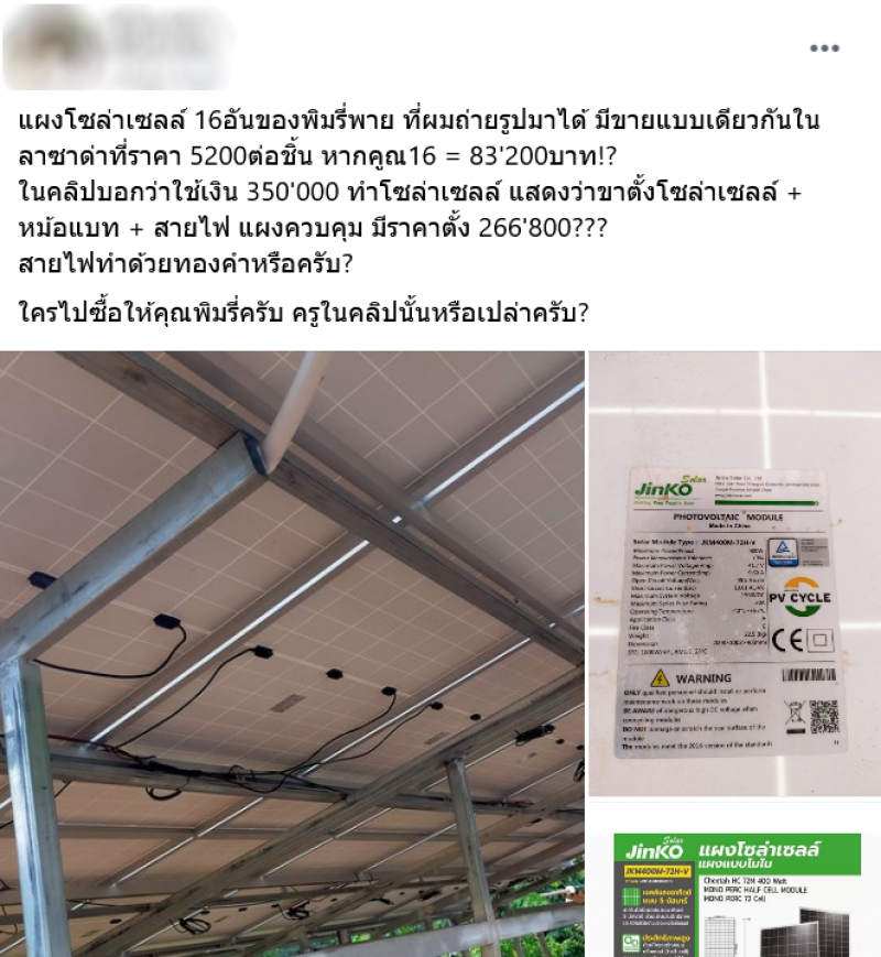 แผงโซลาร์เซลล์ 18 อันของพิมรี่พาย ที่ผมถ่ายรูปมาได้ มีขายแบบเดียวกันใน… ที่ราคา 5200 ต่อชิ้น หากคูณ 18 เท่ากับ 93,600 บาท ในคลิปบอกว่าใช้เงิน 350,000 บาท ทำโซลาร์เซลล์ แสดงว่าขาตั้ง โซลาร์เซลล์ + หม้อแบต + สายไฟ แผงควบคุม มีราคาตั้ง 256,400 บาท สายไฟทำด้วยทองคำหรือครับ ใครไปซื้อให้คุณพิมรี่ครับ ครูในคลิปนั้นหรือเปล่า