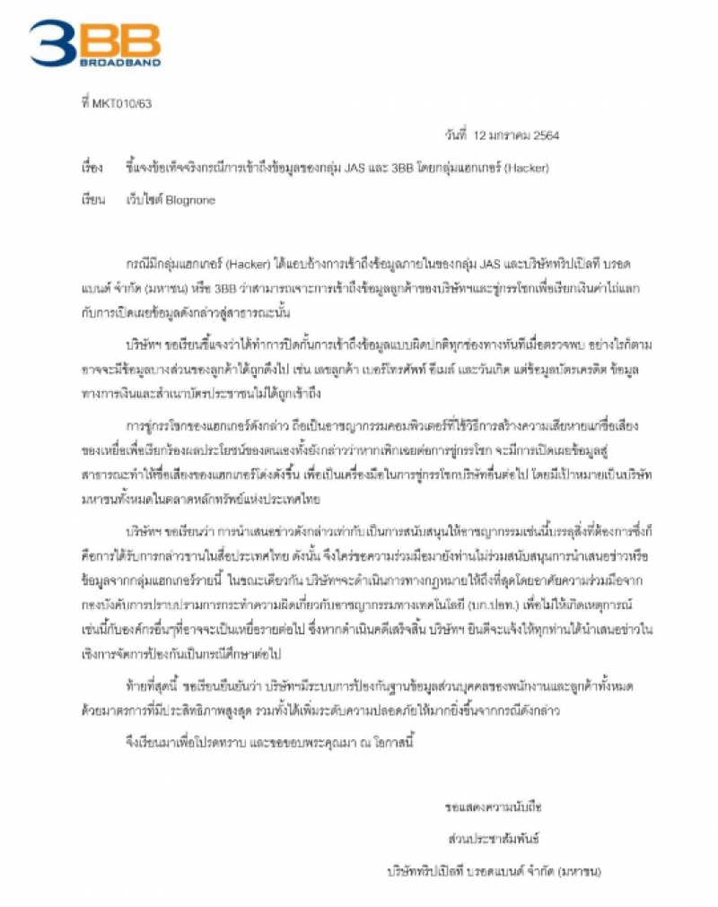 จากกรณี วานนี้ 12 มค. 64 3BB โดนแฮก โดยรายงานข่าวจากเว็บไซต์ Blognone แจ้งว่า มีการแฮกข้อมูลบริษัท Jasmine International บริษัทแม่ของ 3BB (บริษัท ทริปเปิลทีบรอดแบนด์ จำกัด (มหาชน) ผู้ให้บริการอินเทอร์เน็ตรายใหญ่ของไทย และ Mono Group ของกลุ่มแฮกเกอร์ชื่อ Altdos