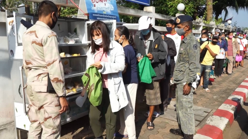 บรรยากาศในเช้าวันนี้ได้ประชาชนมีทั้งผู้สูงอายุ แม่บ้าน เด็ก ได้มาเข้าคิวยืนรออาหารกว่า 200 คน บางคนเลือกเฉพาะสิ่งของที่จำเป็นคนละชิ้น 2 ชิ้น แต่บางคนเอาไปใส่ถุงที่เตรียมมาจำนวนมาก แม้ว่า อส.ที่ดูแลบริเวณดังกล่าวจะขอร้องให้แบ่งปันคนอื่นบ้างเพราะคนเดือดร้อนเยอะ แต่ก็ไม่ยอมถอยหยิบจนพอใจจึงจะออกไป ซึ่งทำให้อาหารหวานคาวหมดไปในเวลาไม่ถึง 10 นาที บางกลุ่มที่ยังไม่ได้หรือได้แล้วก็ยังจับกลุ่มรอคนเอาสิ่งของมาใส่ตู้ เมื่อชาวบ้านเห็นก็กรูกันเข้าหยิบของกันอย่างอลหม่าน