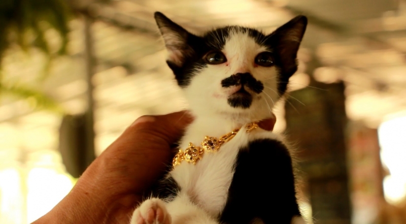 เรียกได้ว่าเป็นอีกหนึ่งเรื่องราว ที่สร้างความฮือฮาเป็นอย่างมาก สำหรับคนที่ชอบแมว แมวตัวหนึ่ง ที่มีลักษณะหน้าตาผิดไปจากแมวตัวอื่นๆ หลังจากมีคนนำไปทิ้งไว้ที่วัดใน อ.บ้านโป่ง จ.ราชบุรี เป็นลูกแมวเพศผู้อายุประมาณ 1-2 เดือน มีสีดำขาว บริเวณเหนือริมปากด้านบนจะมีลักษณะคล้ายกับหนวดของมนุษย์ ส่วนใต้ปากด้านล่างที่คางลักษณะเป็นเคราสีดำคล้ายรูปหัวใจ ไม่เหมือนกับลูกแมวทั่วไปที่เคยพบเห็น