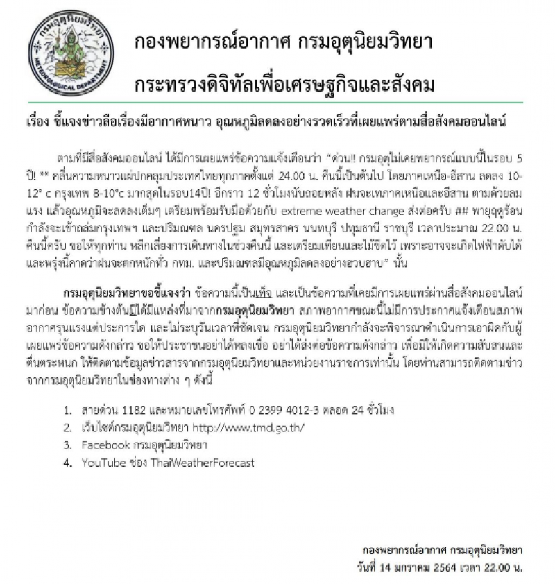 วันที่ 15 มกราคม 2564 กองพยากรณ์อากาศ กรมอุตุฯ กระทรวงดิจิทัลเพื่อเศรษฐกิจและสังคม ออกเอกสารข่าวชี้แจง เรื่อง ข่าวลือเรื่องมีอากาศหนาว อุณหภูมิลดลงอย่างรวดเร็วที่เผยแพร่ตามสื่อสังคมออนไลน์ ดังนี้