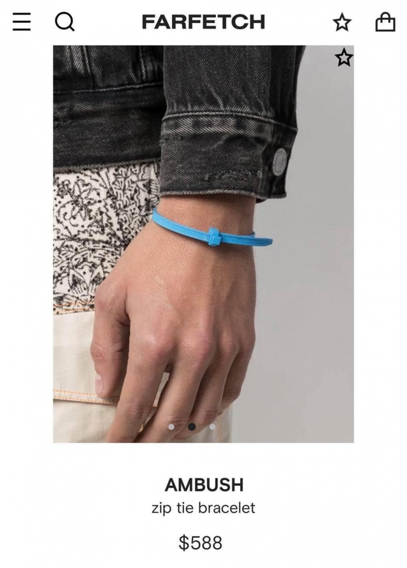 จากกรณีที่ทางเพจ Sneaker Party Thailand ได้มีการเผยภาพเครื่องประดับจากแบรนด์ farfetch ซึ่งมีทั้งแหวน และ กำไล โดยลักษณะดูคล้ายกับสาย เคเบิ้ลไทร์ หรือสายหนวดกุ้งที่มีขายทั่วไป แต่ทว่าเมื่อเห็นราคาแล้วถึงกับตกใจไปตามๆกัน เพราะทางเพจระบุว่า Design ล้ำๆจาก AMBUSH แต่บอกเลยหน้าตาเจ้าคุ้นๆนะ ราคา กำไลอยู่ที่ประมาณ 17,500 บาท แหวนวงเล็กประมาณ 12,000 บาท แหวนวงใหญ่ประมาณ 16,000 บาท
