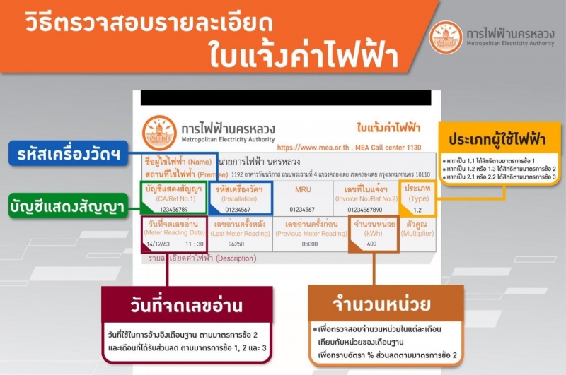ทั้งนี้ ผู้ได้รับสิทธิ์จะได้รับส่วนลดโดยอัตโนมัติในค่าไฟฟ้าประจำเดือนกุมภาพันธ์ และเดือนมีนาคม 2564 โดยสามารถตรวจสอบค่าไฟฟ้าและสิทธิ์ส่วนลดการใช้ไฟฟ้าในแต่ละรอบเดือนได้ที่ ใบแจ้งค่าไฟฟ้า, MEA Smart Life Application และ Line: MEA Connect