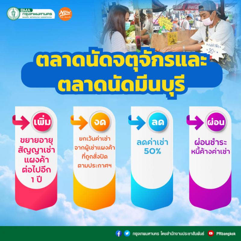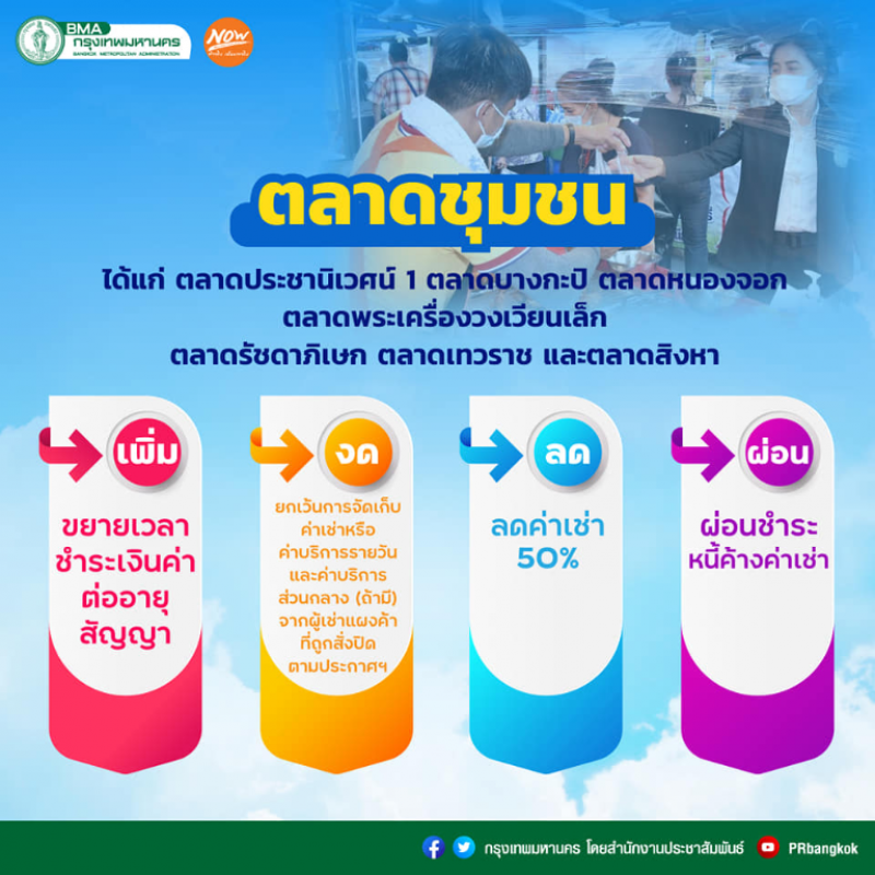 ทั้งนี้ ผู้ค้า และผู้เช่าในตลาดกรุงเทพมหานคร 10 แห่ง สามารถดูรายละเอียดมาตรการเยียวยา และช่วยเหลือได้ทางเว็บไซต์ www bangkok go th