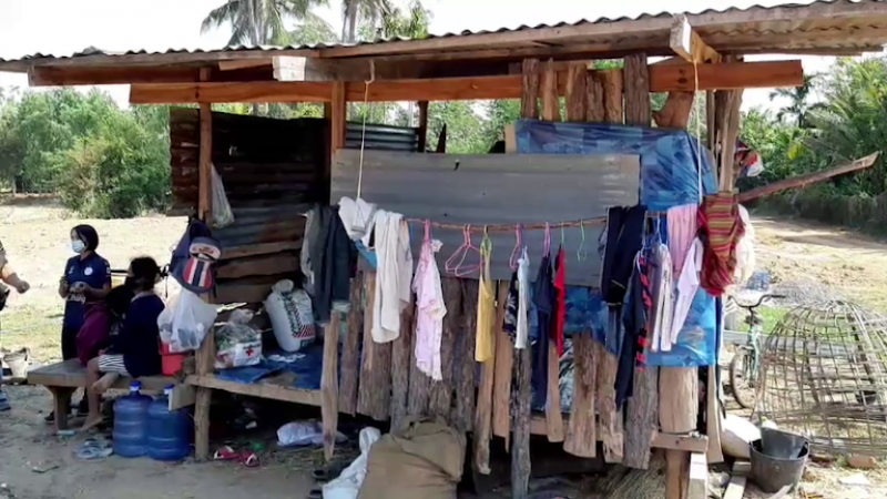 จากการตรวจสอบพบเป็นกระท่อมหลังเล็กขนาด 4X4 เมตร ไม่มีเลขที่ ทำด้วยเศษไม้ ปีกไม้ บ้านหลังนี้อยู่ด้วยกัน 3 คน คือพ่อ แม่ และลูกสาววัย 10 ปี เรียนอยู่ชั้น ป.4 โรงเรียนในหมู่บ้าน โดยนางกันแดน สับประโคน อายุ 43 ปี บ้านเลขที่ตามบัตรประชาชน 59 หมู่ 7 ต.เขาคอก อ ประโคนชัย จ.บุรีรัมย์ เล่าความเป็นมาว่า ตนกับสามีมีอาชีพทำงานก่อสร้างที่กรุงเทพฯ มาโดยตลอด ย้ายไปตามไซต์งานต่างๆ มีลูกติดกับสามีเก่า 1 คน เอาฝากญาติเลี้ยงที่บุรีรัมย์ เมื่อถึงเกณฑ์เรียนหนังสือ จึงเอาไปฝากเรียนที่โรงเรียนสงเคราะห์นางรอง ซึ่งเป็นโรงเรียนประจำ โดยจะมาเยี่ยมเป็นบางครั้งถ้ามีโอกาส แต่เมื่อช่วง 5-6 เดือนที่ผ่านมา ตนกับสามีตกงาน ไม่มีงานทำ จึงตัดสินใจกลับบ้านที่บุรีรัมย์ ไปขออาศัยอยู่กับญาติ เพราะไม่มีบ้านและที่ดินเป็นของตัวเอง