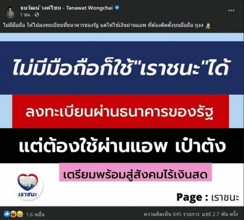 เมื่อวันที่ 23 มกราคม แฟนเพจ เราชนะ ได้โพสต์ภาพ พร้อมข้อความ ระบุว่า อย่าลืม ไม่มีมือถือ ลงผ่านธนาคาร ใช้จ่ายผ่านแอพ กันนะทุกคน