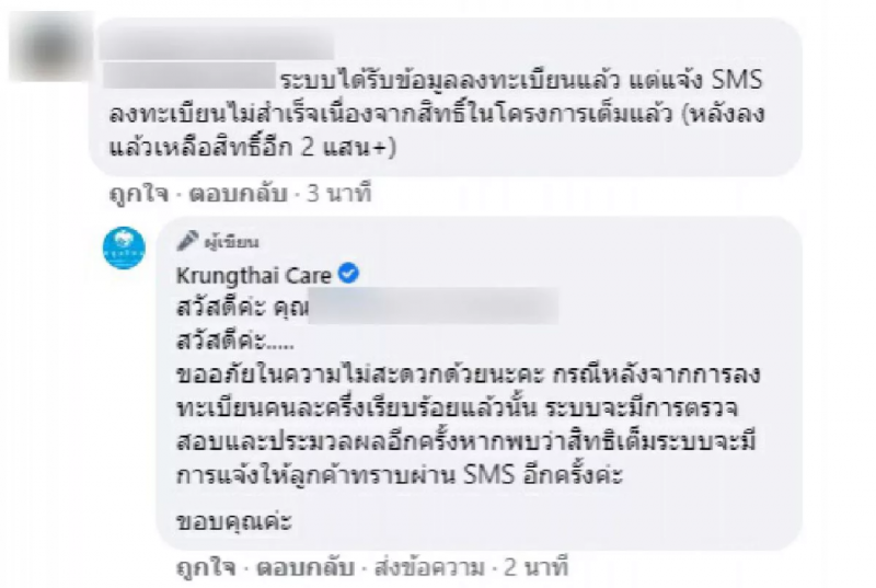 ล่าสุดมีชาวเน็ตท่านหนึ่งเข้าไปสอบถามกับทางเพจธนาคารกรุงไทย เกี่ยวกับปัญหาดังกล่าวในการลงทะเบียน "คนละครึ่ง" เนื่องจากเจ้าตัวก็ได้รับ sms บอกลงทะเบียนไม่สำเร็จ ทั้งๆที่ตอนลงนั้นเหลือสิทธิ์อีกกว่า 2 แสนสิทธิ์
