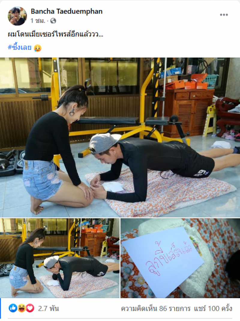 เรียกได้ว่าเป็นอีกหนึ่งเรืองราว ที่เรียกเสียงฮาเป็นอย่างมาก เมื่อหนุ่มได้โพสต์ภาพ ภรรยามาเซอร์ไพรส์ ขณะที่ตนเองกำลังออกกำลังกายในท่า แพลงกิ้ง เหมือนกับในตอนที่ นักร้องดัง ตูน บอดี้สแลม เซอร์ไพรส์ แฟนสาว ก้อย ขณะออกกำลังกายในท่าแพลงกิ้ง แต่ทว่าในกรณีนี้ ภรรยาของเขาได้เขียนข้อความมาวางไว้ข้าง เมื่อเขาได้เห็นข้อความ ถึงกับซึ้งใจแทบหมดแรง และเชื่อว่าคุณพ่อบ้านท่านไหนได้เห็นข้อความแบบนี้ ก็คงต้องรู้สึกเช่นเดียวกัน ซึ่งหลังจากที่ได้มีการเผยแพร่ภาพออกไปก็มีชาวโซเชียลเข้ามาคอมเม้นท์กันมากมาย นี่แหละที่เรียกว่าวิถีพ่อบ้าน