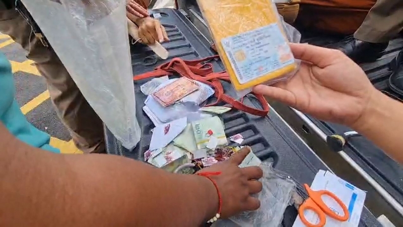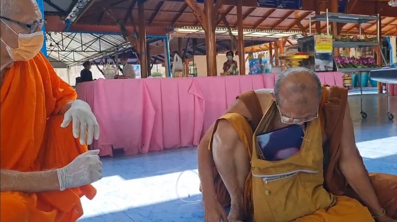 เมื่อนำตัวมาถึง สน.แสมดำ ตำรวจได้ตรวจค้นในย่ามพบเงินสดแบงก์ 20 จำนวนมาก ที่ญาติโยมทำบุญ และสายสิญจน์ที่นำมาแจกกับคนที่ใส่บาตรถวายเป็นเงินสด พบโทรศัพท์ 2 เครื่อง มีข้อความส่งผ่านแอปพลิเคชันไลน์ กับสีกา เรื่องการขอเงินใช้ และมีการแช็ตคุยเรื่องการซื้อรถ นอกจากนี้ยังพบในสมุดบัญชี มีเงินแสนกว่าบาท และวิทยุเทปลำโพง