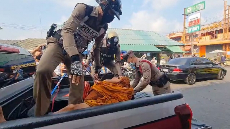 ตำรวจ สน.แสมดำ นำพร้อมกำลังสายตรวจรับแจ้งจากประชาชน มีพระสงฆ์ มาบิณฑบาตในหมู่บ้านพระปิ่น 5 มีพฤติการณ์ไม่เหมาะสม และนั่งฉันข้าวข้างถนน จึงเดินทางไปตรวจสอบ ขณะพระสงฆ์รูปดังกล่าวเห็นรถสายตรวจแล้วรีบเดินหลบหนี ตำรวจพยายามเชิญตัวไป สน. แต่ไม่เป็นผลจนต้องใช้กำลังเพื่อจะนำไปขึ้นรถตำรวจ