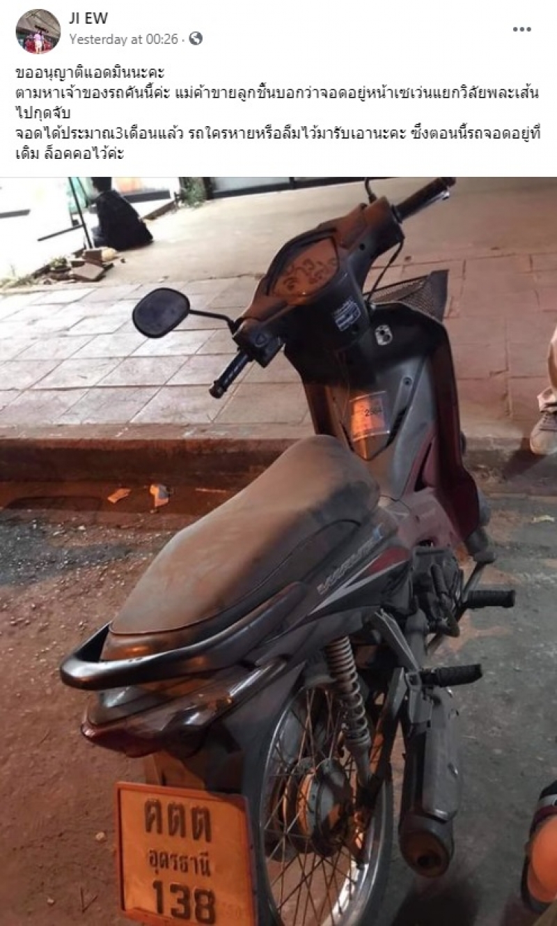 จากกรณีที่มีผู้ใช้เฟซบุ๊ก JI EW โพสต์ข้อความและภาพลงในกลุ่ม อุดร มีด่าน มีข่าว มีหมอลำ งานบุญ มีเหตุการณ์ต่างๆ บอกด้วย ว่า ขออนุญาติแอดมินนะคะ ตามหาเจ้าของรถคันนี้ค่ะ แม่ค้าขายลูกชิ้นบอกว่าจอดอยู่หน้าเซเว่นแยกวิลัยพละเส้นไปกุดจับจอดได้ประมาณ3เดือนแล้ว รถใครหายหรือลืมไว้มารับเอานะคะ ซึ่งตอนนี้รถจอดอยู่ที่เดิม ล็อคคอไว้ค่ะ แต่ยังไม่มีใครมาเอาไปและมาติดต่อ