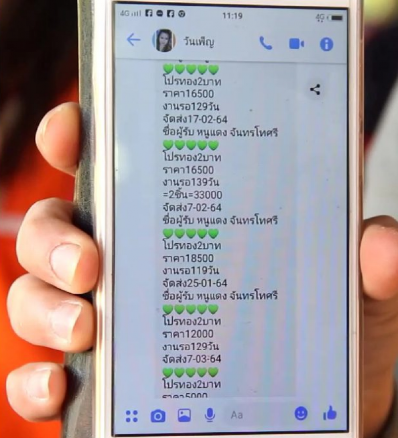 แต่ตนมาผิดสังเกตเมื่อปลายปี 63 เพราะโปรทอง ถูกลงมาก เช่น 2 บาทเพียง 2,000 บาท 2 ชิ้น 4,000 บาท จึงมีชาวบ้านหลงเชื่อนำเงินไปลงทุน แต่เมื่อต้นเดือน ม.ค. ปรากฏว่า น.ส.วันเพ็ญ ปิดทั้งเฟซบุ๊กและกลุ่มไลน์หนีไป