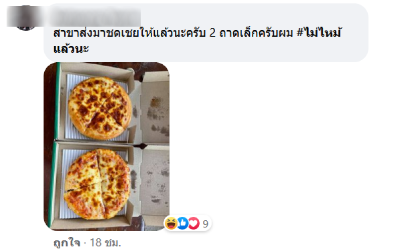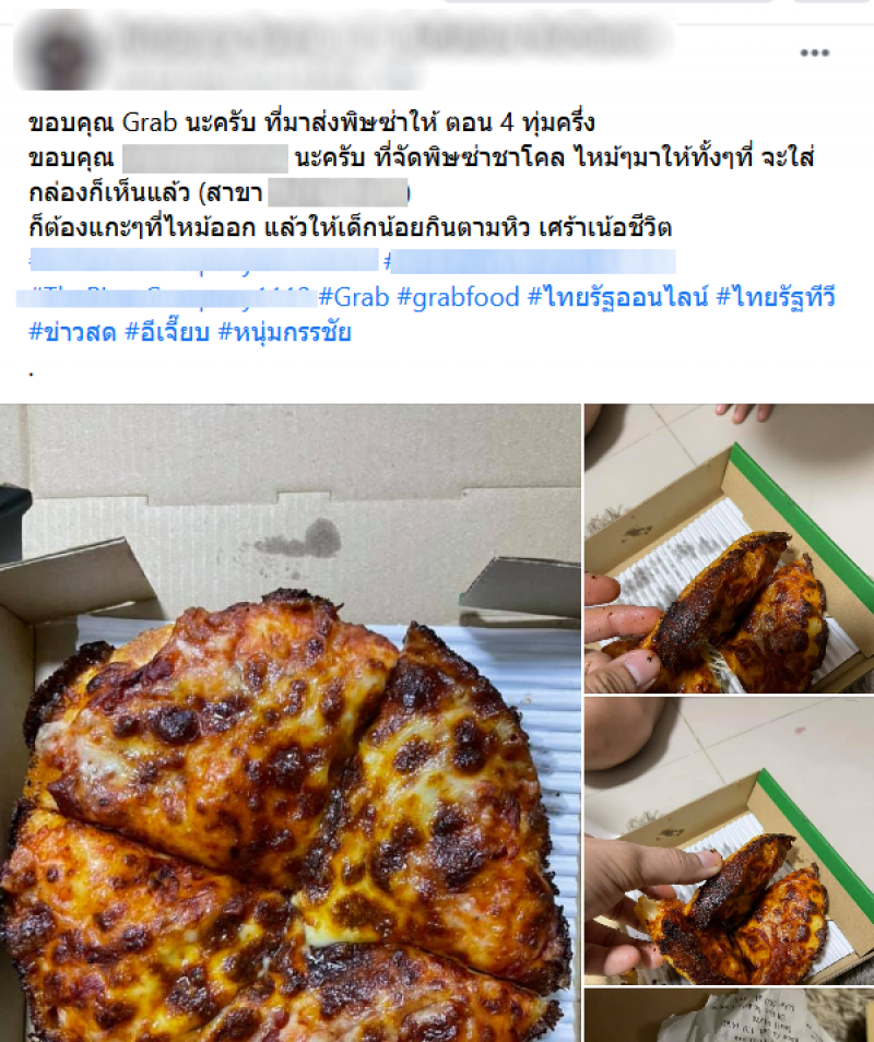 เรียกได้ว่าเป็นอีกหนึ่งเรื่องราว ที่ถูกพูดถึงอย่างมากในโลกออนไลน์ จากกรณีผู้ใช้เฟซบุ๊กรายหนึ่ง ได้มีการโพสต์เรื่องราว หลังจากที่เขาได้สั่งพิซซ่าจากร้านชื่อดังมาทาน โดยใช้บริการผ่านแกร๊บฟู้ด แต่ทว่าพอพนักงานนำพิซซ่ามาส่ง กลับพบว่า พิซซ่าในถาดนั้นไหม้ ทำให้ต้องกินกันแบบนั้น เนื่องจากหิวมาก อย่างไรก็ตามหลังจากที่เจ้าตัวได้ส่งเรื่องร้องเรียนไป ทางสาขาดังกล่าว ก็ได้ส่งพิซซ่าถาดใหม่มาชดเชยให้แล้ว
