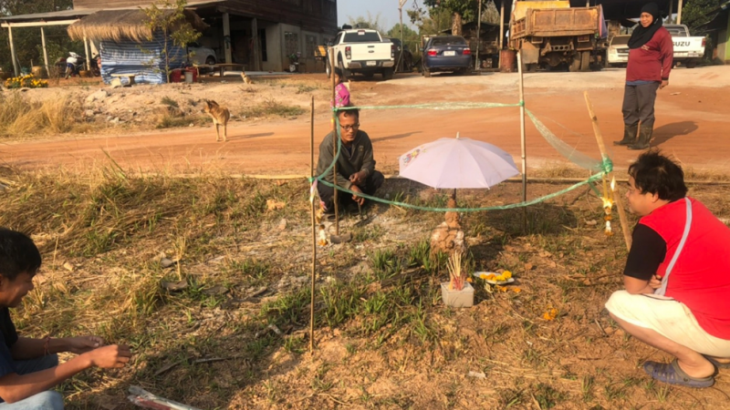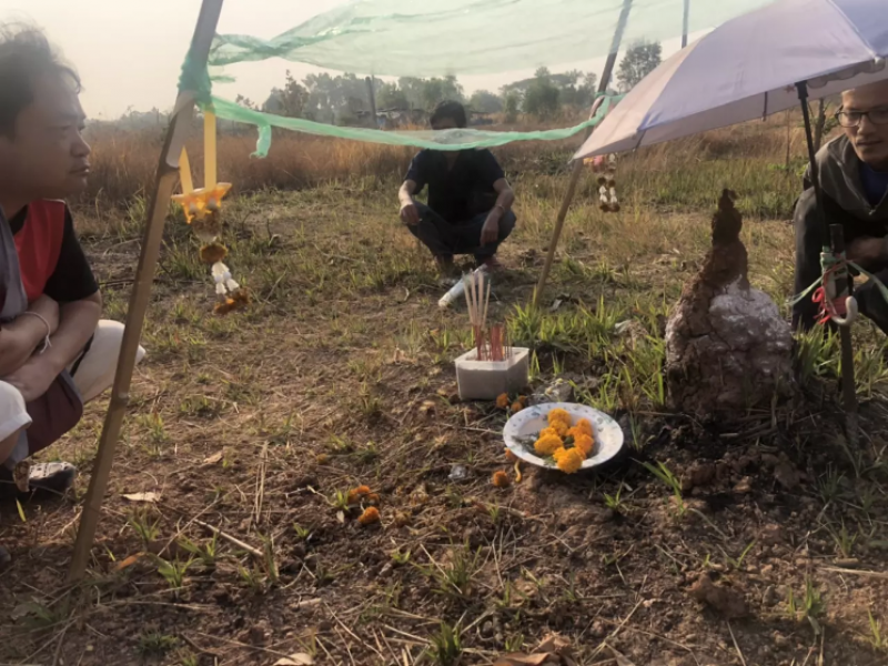 นายคำปุ่น เชนปี เจ้าของบ้านที่พบเห็นเป็นคนแรกบอกว่า ก่อนที่จะพบจอมปลวก ที่รูปคล้ายพระพุทธรูปว่ามีกิ่งไม้ที่หน้าบ้านหักลงมาข้างจอมปลวก แต่ไม่ทับ จากนั้นก็นอนฝันว่าได้กราบพระพุทธรูป ก็ไม่ได้คิดอะไร ก็มาเอากิ่งไม้ออกจึงพบจอมปลวกคล้ายพระพุทธรูปเหมือนที่ฝัน ไม่ได้ทำพิธีอะไรเพียงแค่เอาร่มมากางให้ ล้อมเชือกธรรมดา แต่ก็มีชาวบ้านที่ทราบเรื่องมากราบไหว้กัน ไม่รู้ผลออกมาอย่างไร ตนเองก็ไม่เคยซื้อเลข แต่คราวนี้จะชื้อบ้าง เห็นคนมากราบไหว้เยอะก็เลยอยากลองแค่นั้นเอง