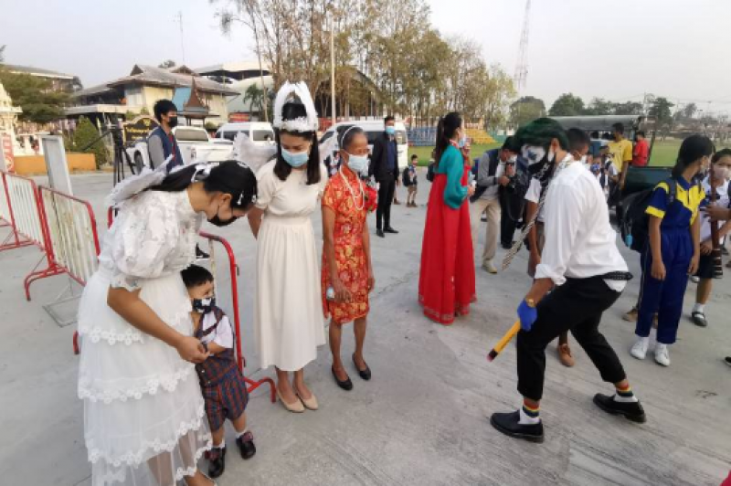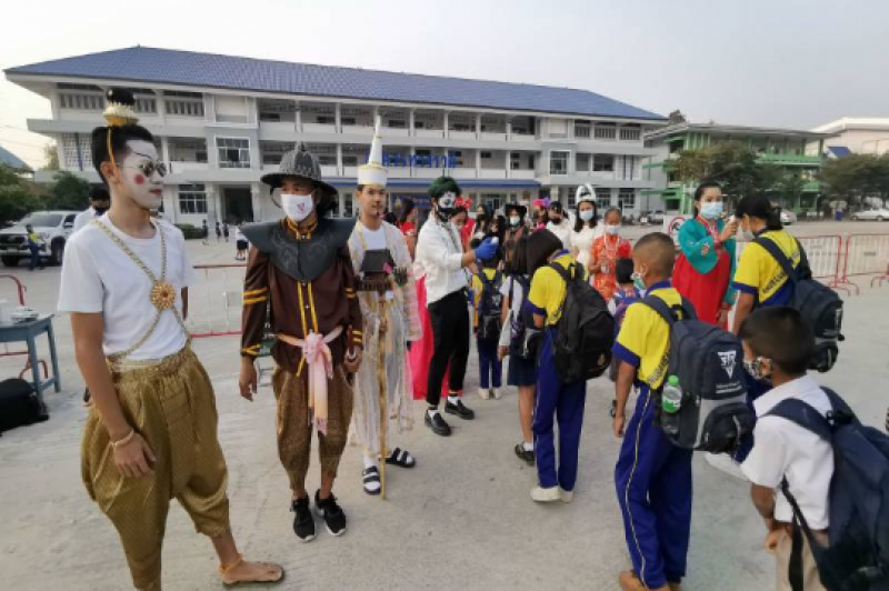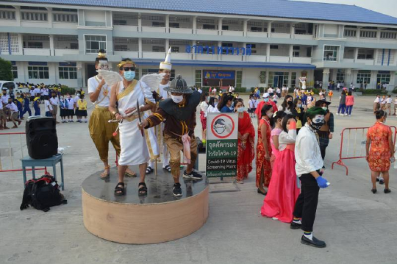 โดยครูเกือบ 100 คน พร้อมใจกันแต่งชุดแฟนซีมายืนรอรับนักเรียนของตนเองที่ด้านหน้าจุดคัดกรอง มีการตรวจวัดอุณหภูมิร่างกาย การล้างมือด้วยเจลแอลกอฮอล์ การเว้นระยะห่าง ตามมาตรการของ ศบค.อย่างเคร่งครัด