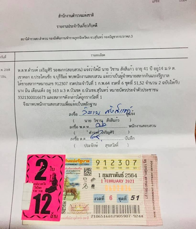 ล่าสุดมีอีกหนึ่งเรื่องราวดี ๆ ที่บอกเลยว่าได้รับคำชื่นชมจากผู้คนในโลกสังคมออนไลน์อย่างมากอยู่ในขณะนี้ เมื่อเพจเฟซบุ๊ก ที่นี่ประโคนชัย มีรายงานเรื่องราวน่ารัก ๆ ของพ่อค้าสลากกินแบ่งรัฐบาลรายหนึ่ง ที่ได้นำลอตเตอรี่ของลูกค้า ซึ่งถูกรางวัลที่ 1 หมายเลขที่ออก 912307 จำนวน 2 ใบ นำไปลงบันทึกประจำวันไว้กับสถานีตำรวจ เพื่อรอเจ้าของลอตเตอรี่มารับไปขึ้นเงินรางวัล