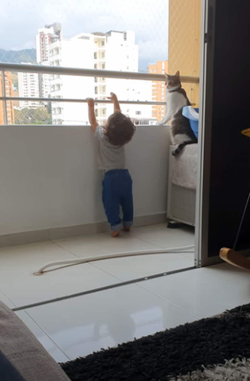 พี่เลี้ยงเหมียวที่กำลังยืนดูวิวฟินๆ เห็นน้องพยายามจะปีนราวระเบียง มันก็ตัดสินใจหยุดเขา ด้วยการปัดมือเขาออกจากราว แต่ดูเหมือนว่าความพยายามครั้งแรกจะไม่สามารถหยุดความอยากรู้อยากเห็นของหนูน้อยได้ เขาถอยห่างจากพี่เหมียวและพยายามปีนราวระเบียงอีกครั้ง