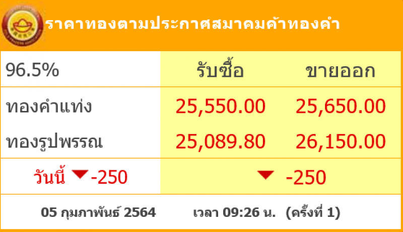 วันที่ 5 กุมภาพันธ์ 2564 ผู้สื่อข่าวรายงานว่า สมาคมค้าทองคำรายงาน ราคาทองไทย ครั้งที่ 1 เมื่อเวลา 09:26 น. โดยราคาทองล่าสุดในวันนี้ ได้มีการปรับลดลงมาถึง 250 บาท หลังจากที่มีการปรับลดมาอย่างต่อเนื่อง โดยวันนี้ทองคำแท่ง รับซื้อบาทละ 25,550 ขายออกบาทละ 25,650 บาท ส่วนทองรูปพรรณ รับซื้อบาทละ 25,089.80 ขายออกบาทละ 26,150 บาท