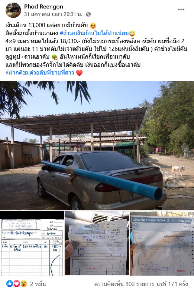 โดยผู้โพสต์โดยระบุว่า เงินเดือน 13,000 แต่อยากมีบ้านคับ ผิดมั้งถูกมั้งบ้านเราเอง ถ้ารอเงินก้อนไม่ได้ทำแน่ผม 4×9 เมตร หมดไปแล้ว 18,030.- (ยังไม่รวมกระเบื้องหลังคาน้ะคับ ผมซื้อมือ 2 มา แผ่นละ 11 บาทคับไม่เจาะด้วยคับ ใช้ไป 126แผ่นมั้งลืมคับ ) ค่าช่างไม่มีคับดูยูทูป+ถามเอาคับ อันไหนหนักก็เรียกเพื่อนมาคับ และก็มีพวกของจุ๊กจิ๊กไม่ได้คิดคับ เงินออกก็แบ่งซื้อเอาคับ #ฝากติชมด้วยคับพี่ชายพี่สาว