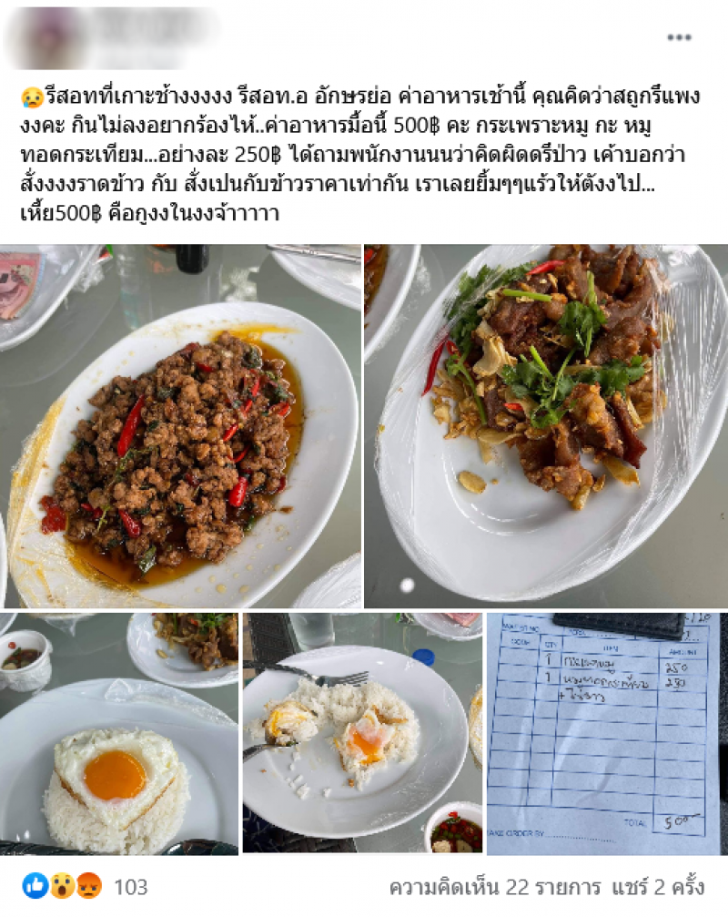 เรียกได้ว่าเป็นอีกหนึ่งเรื่องราว ที่เรียกเสียงวิพากษ์วิจารณ์เป็นอย่างมาก หลังจากที่มีผู้ใช้เฟซบุ๊กรายหนึ่ง ได้โพสต์ภาพเมนูอาหารที่รีสอร์ทแห่งหนึ่งบนเกาะช้าง โดยผ้โพสต์ระบุว่า "รีสอทที่เกาะช้างงงงง รีสอท.อ อักษรย่อ ค่าอาหารเช้านี้ คุณคิดว่าสถูกรึแพงงงคะ กินไม่ลงอยากร้องไห้..ค่าอาหารมื้อนี้ 500฿ คะ กระเพราะหมู กะ หมูทอดกระเทียม...อย่างละ 250฿ ได้ถามพนักงานนนว่าคิดผิดดรึป่าว เค้าบอกว่าสั่งงงงราดข้าว กับ สั่งเปนกับข้าวราคาเท่ากัน เราเลยยิ้มๆๆแร้วให้ตังงไป...เหี้ย500฿ คืองงในงงจ้าาาาา"