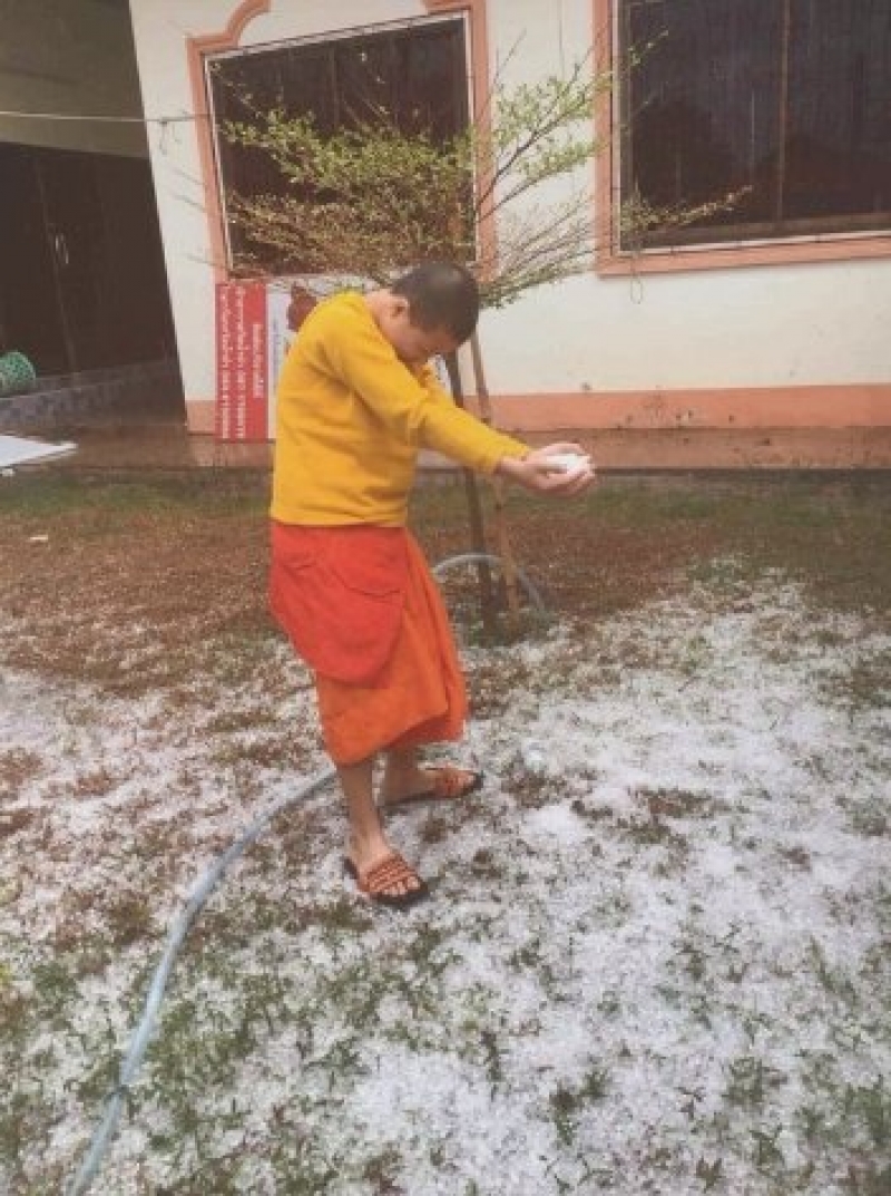ขณะที่วัดน้ำจำ ต.โป่งผา อ แม่สาย จ.เชียงราย บ้านน้ำจำซอย2 พระอาจารย์คพ เทพวงค์ ได้เผยภาพนิ่งขณะที่พระภิกษุสามเณรของวัดกำลังเก็บ ลูก เห็บ ที่ตกลงบนลานพื้นของวัดจนขาว โพลน มาเล่นอย่างสนุกสนาน ซึ่งก็ยังไม่มีรายงานความ เสีย หาย ต่อบ้านเรือนหรือทรัพย์สินของประชาชนเช่นเดียวกัน