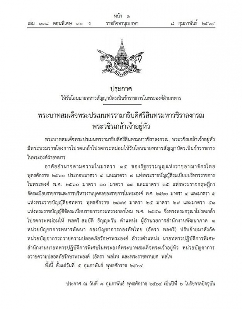 วันที่ 9 ก.พ.2564 ผู้สื่อข่าวรายงานว่า เว็บไซต์ราชกิจจานุเบกษา เผยแพร่ ประกาศให้รับโอนนายทหารสัญญาบัตรเป็นข้าราชการในพระองค์ฝ่ายทหาร ระบุว่า พระบาทสมเด็จพระปรเมนทรรามาธิบดีศรีสินทรมหาวชิราลงกรณ พระวชิรเกล้าเจ้าอยู่หัวมีพระบรมราชโองการโปรดเกล้าโปรดกระหม่อมให้รับโอนนายทหารสัญญาบัตรเป็นข้าราชการ ในพระองค์ฝ่ายทหาร