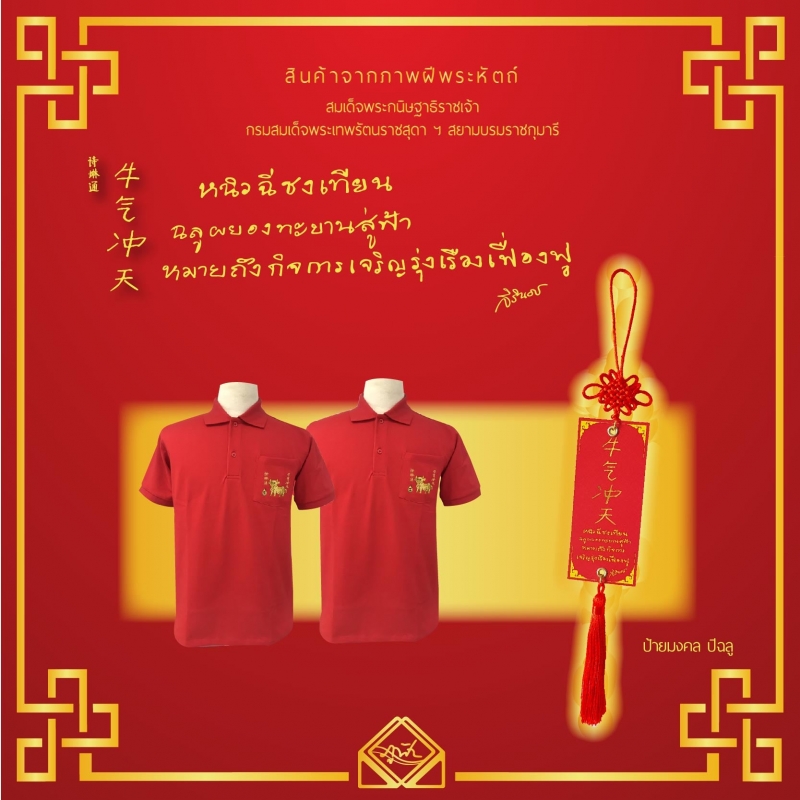 ดังนั้น เพื่อความเป็นสิริมงคลยิ่ง สำหรับทุกท่าน ทางร้านภูฟ้าจึงได้อัญเชิญภาพฝีพระหัตถ์รูปวัวหน้าตาน่ารัก พร้อมทั้งลายพระหัตถ์พรพระราชทาน ภาษาจีนคือ หนิว ฉี ชง เทียน มาปักบนกระเป๋าเสื้อโปโลสีแดง และจัดทำป้ายมงคลพรพระราชทาน นำมาจำหน่ายเป็นของขวัญวันตรุษจีน ปี พ.ศ. ๒๕๖๔ เพื่อให้เทศกาลตรุษจีน เป็นเทศกาลแห่งความรุ่งเรือง เฟื่องฟู ความอุดมสมบูรณ์ มีโชค มีลาภ และมีความสุข กันถ้วนหน้า