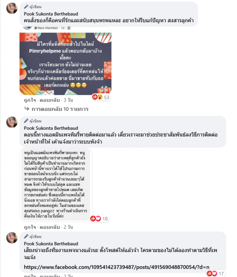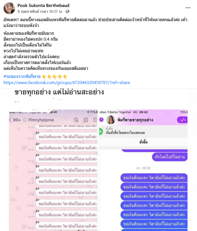 จากกรณีที่มีประเด็นดราม่าในโลกออนไลน์ ว่าด้วยเรื่องสั่งของจากไอดอลสาวคนดัง อย่างพิมรี่พาย ที่มีหลายคนออกมาเผยว่า สั่งของไปนานแล้ว แต่ยังไม่ได้ ติดต่อก็ไม่ได้ ล่าสุดมีอีกหนึ่งประเด็นที่สร้างความฮือฮาในโซเชียล เมื่อผู้ใช้เฟซบุ๊กชื่อ Pook Sukonta Berthebaud ซึ่งเป็นคนดังในโซเชียล ที่มักจะโผล่มาช่วย และพูดถึงประเด็นดราม่าในหลายๆเหตุการณ์