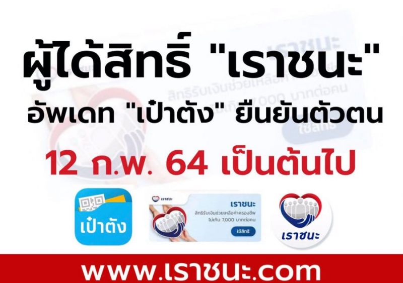 ล่าสุด วันนี้ (11 ก.พ.) แฟนเพจเฟซบุ๊ก "เราชนะ" แจ้งผู้ที่ได้รับสิทธิ "เราชนะ" www.เราชนะ.com ว่า พรุ่งนี้ 12 ก.พ. ผู้ได้สิทธิเราชนะ อย่าลืม อัพเดท เป๋าตัง เพื่อกดรับสิทธิ โดยสามารถอัพเดทแอพเป๋าตังเวอร์ชั่นใหม่ 10.32.0 ได้ที่ Play Store หรือ App Store จากนั้นเข้าไปยืนยันตัวตน G-Wallet และยืนยันการใช้สิทธิ์เราชนะได้ ทุกคนจะได้รับเงินงวดแรก 2,000 ซึ่งสามารถใช้จ่ายได้ตั้งแต่วันที่ 18 ก.พ. เป็นต้นไป