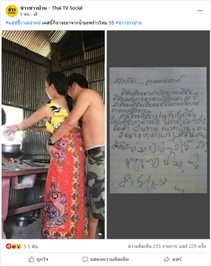เรียกได้ว่าเป็นอีกหนึ่งเรื่องราวที่โลกออนไลน์แสดงความคิดเห็น และให้ความสนใจกันเป็นจำนวนมาก หลังเฟสบุ๊ค ข่าวชาวบ้าน - Thai TV Social ได้ออกมาโพสต์ภาพคู่บ่าวสาว โดยฝ่ายหญิงเขียนข้อความไว้ ว่าปัญหาหลังเจ้าตัวแต่งงาน กับแฟนหนุ่ม โดยแฟนหนุ่มติดหนักมาก และสามี มีความต้องการสูง โดย จะร่ ว ม รั ก ไม่ว่าจะทำอะไร รีดผ้า ล้างจานก็ ไม่เว้น ทั้งนี้เฟสดังกล่าวยังได้ระบุข้อความว่า