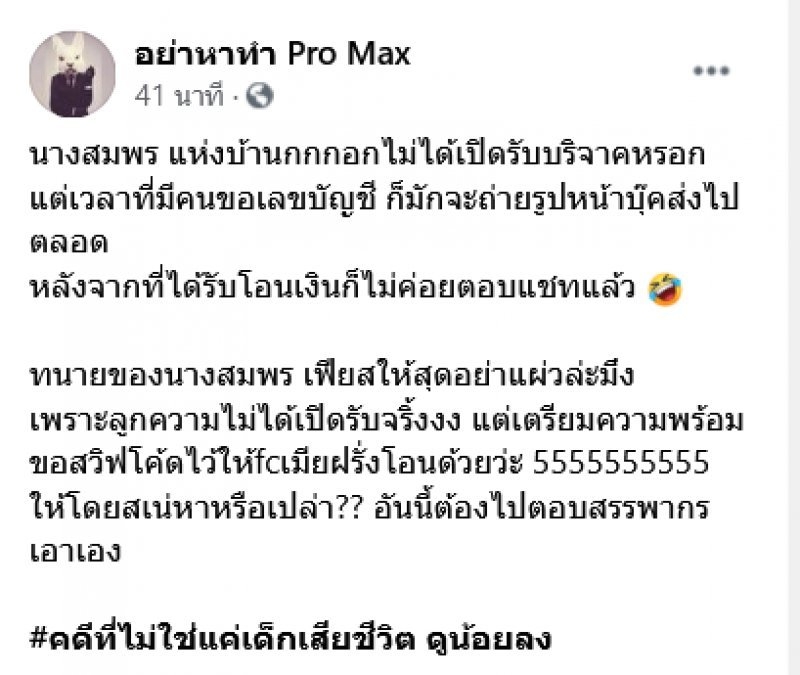 จากกรณีเพจ อย่าหาทำ Pro Max ได้โพสต์ข้อความระบุว่า นางสมพร แห่งบ้านกกกอกไม่ได้เปิดรับบริจาคหรอก แต่เวลาที่มีคนขอเลขบัญชีก็มักจะถ่ายรูปหน้าบุ๊คส่งไปตลอด หลังจากที่ได้รับโอนเงินก็ไม่ค่อยตอบแชทแล้ว ทนายของนางสมพร เฟียสให้สุดอย่าแผ่วล่ะ เพราะลูกความไม่ได้เปิดรับจริ้งงงแต่เตรียมความพร้อมขอสวิฟโค้ดไว้ให้ fc เมีย ฝรั่งโอนด้วยว่ะ 5555555555 ให้โดยเสน่หาหรือเปล่า อันนี้ต้องไปตอบสรรพากรเอาเอง
