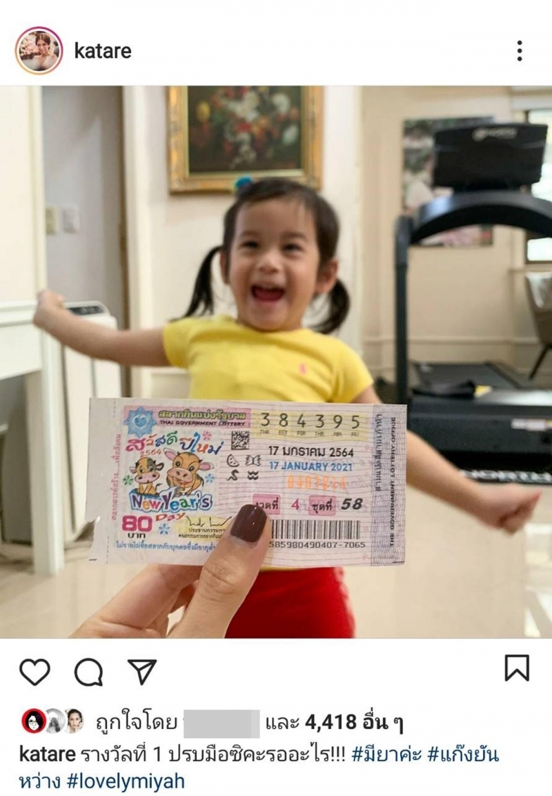 จากกรณี กระแต เสาวคนธ์ ภรรยาของ เติ้ล ตะวัน โพสต์รูปถูกลอตเตอรี่รางวัลที่ 1 6 ล้าน ไป ถูกเมื่อวันที่ 17 มกราคม 2564 ที่ผ่านมา ก็มีเพื่อนๆ เข้ามาคอมเมนต์แสดงความยินดีกับสาวกระแตมากมาย ล่าสุด เจ้าตัวได้เดินทางไปที่กองสลากเพื่อขึ้นเงินรางวัลเป็นที่เรียบร้อยแล้ว