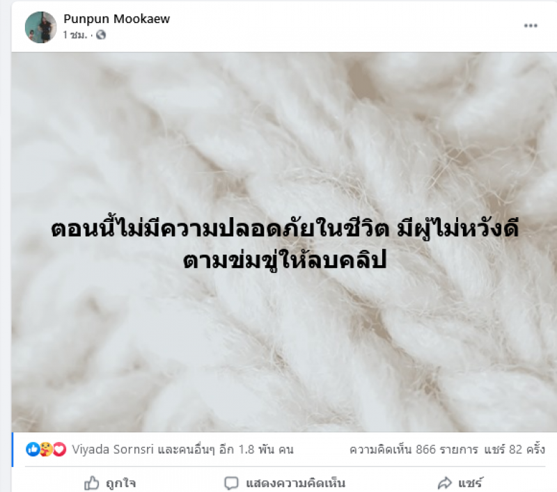 ล่าสุดทำเอาหลายๆคนอดห่วงไม่ได้ หลังจากเจ้าตัวโพสต์คลิปก็ได้ออกมาโพสต์ล่าสุด เมื่อ 1 ชั่วโมงที่ผ่านมากโดยได้ระบุข้อความว่า ตอนนี้ไม่มีความปลอดภัยในชีวิต มีผู้ไม่หวังดีตาม ข่ ม ขู่ ให้ลบคลิป
