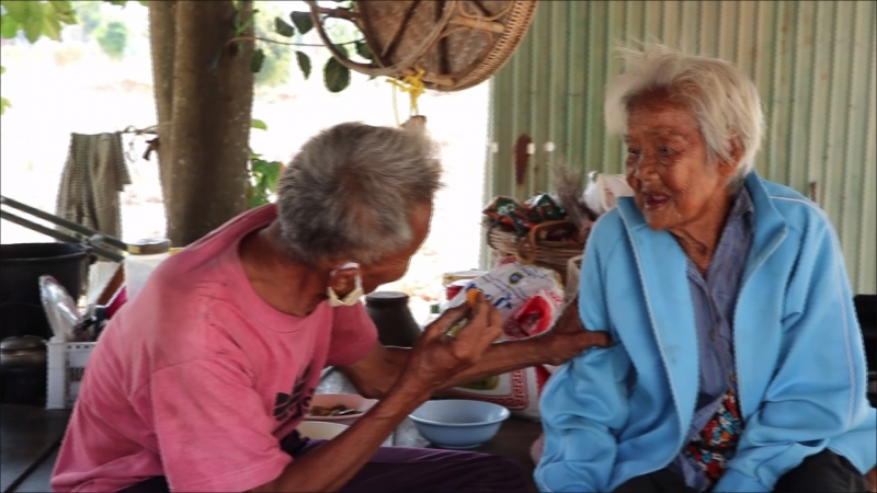 ในวันนี้ (19 ก.พ.) พบว่า นางน้อย เอี่ยมสะอาด อายุ 81 ปี เป็นมารดาของ นายจำเนียร เอี่ยมสะอาด อายุ 62 ปี และนางเล็ก บุญทัศน์ อายุ 60 ปี ม.10 ต.วังไทร อ.คลองขลุง จ.กำแพงเพชร นั่งอยู่ในกระท่อมไม้ข้างบ้าน ซึ่งเป็นที่สำหรับประกอบอาหารรับประทานอาหาร พูดคุยด้วยสีหน้ายิ้มแย้มแจ่มใส อารมณ์ดี โดยนายจำเนียร ลูกชายได้หยอกล้มแม่เล่นนำขนมป้อนข้าวนางน้อยซึ่งเป็นมารดา พร้อมกับพูดว่า วันนั้นแม่ป้อนข้าวลูก วันนี้ลูกขอป้อนแม่บ้าง เป็นภาพที่น่ารักอีกมุมหนึ่งของสองแม่ลูก ส่วนยอดเงินในบัญชี พบว่า มีผู้ใจบุญช่วยเหลือกันอย่างต่อเนื่อง ขณะนี้จำนวน 7,200,000 บาท