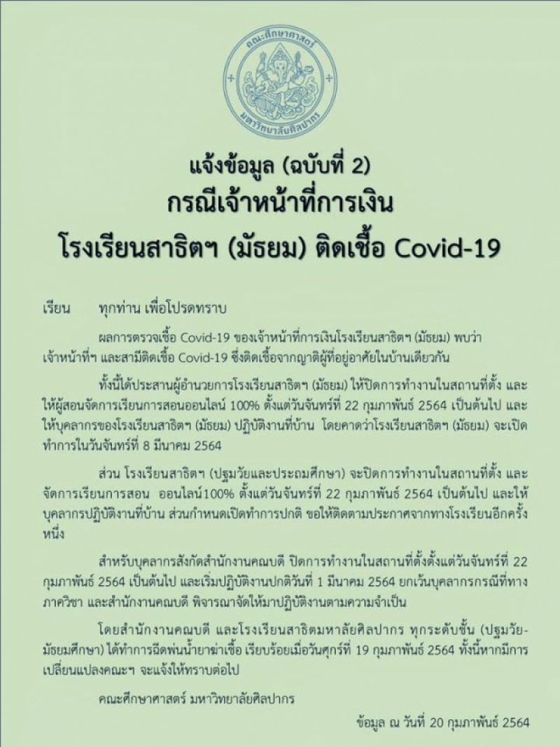 หลังมีประกาศของคณะศึกษาศาสตร์ ม.ศิลปากร จ.นครปฐม ข้อมูลณวันที่ 20 ก.พ. 2564 ถึงผลการตรวจ cvของเจ้าหน้าที่การเงินโรงเรียนสาธิตในระดับชั้นมัธยม พบว่า เจ้าหน้าที่และสามีติด cv ซึ่งติดcvจากญาติผู้ที่อาศัยอยู่ในบ้านเดียวกัน